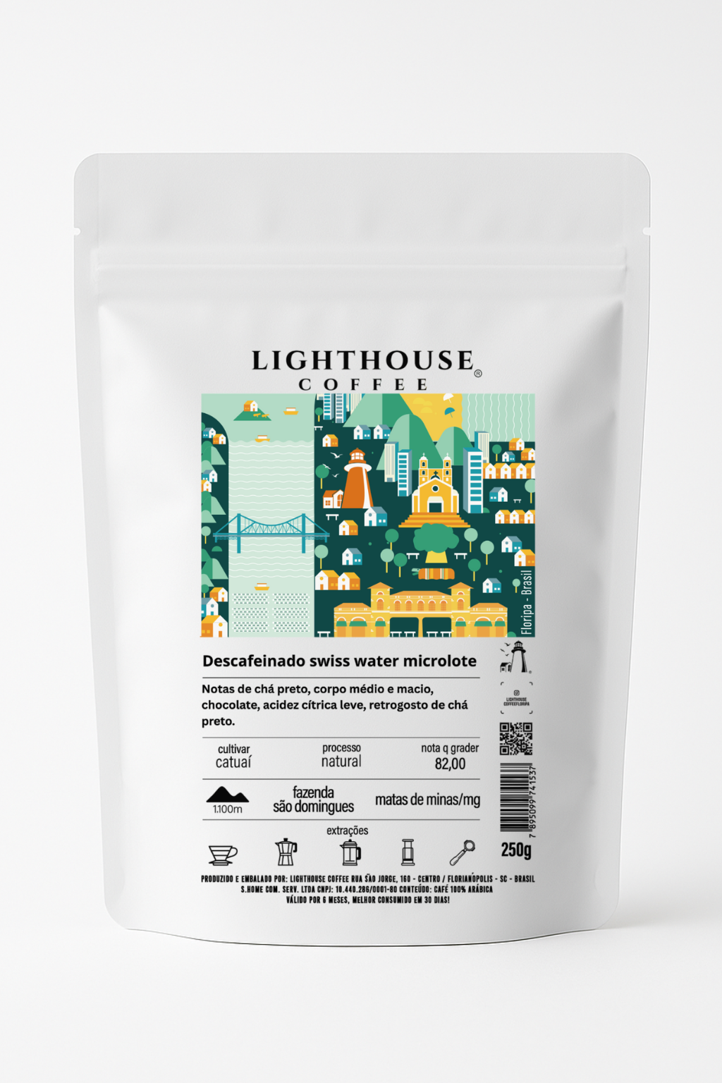 A descafeinação é feita pelo processo Swiss Water, um método único e livre de produtos químicos que remove a cafeína dos grãos ainda verdes por meio da água.
